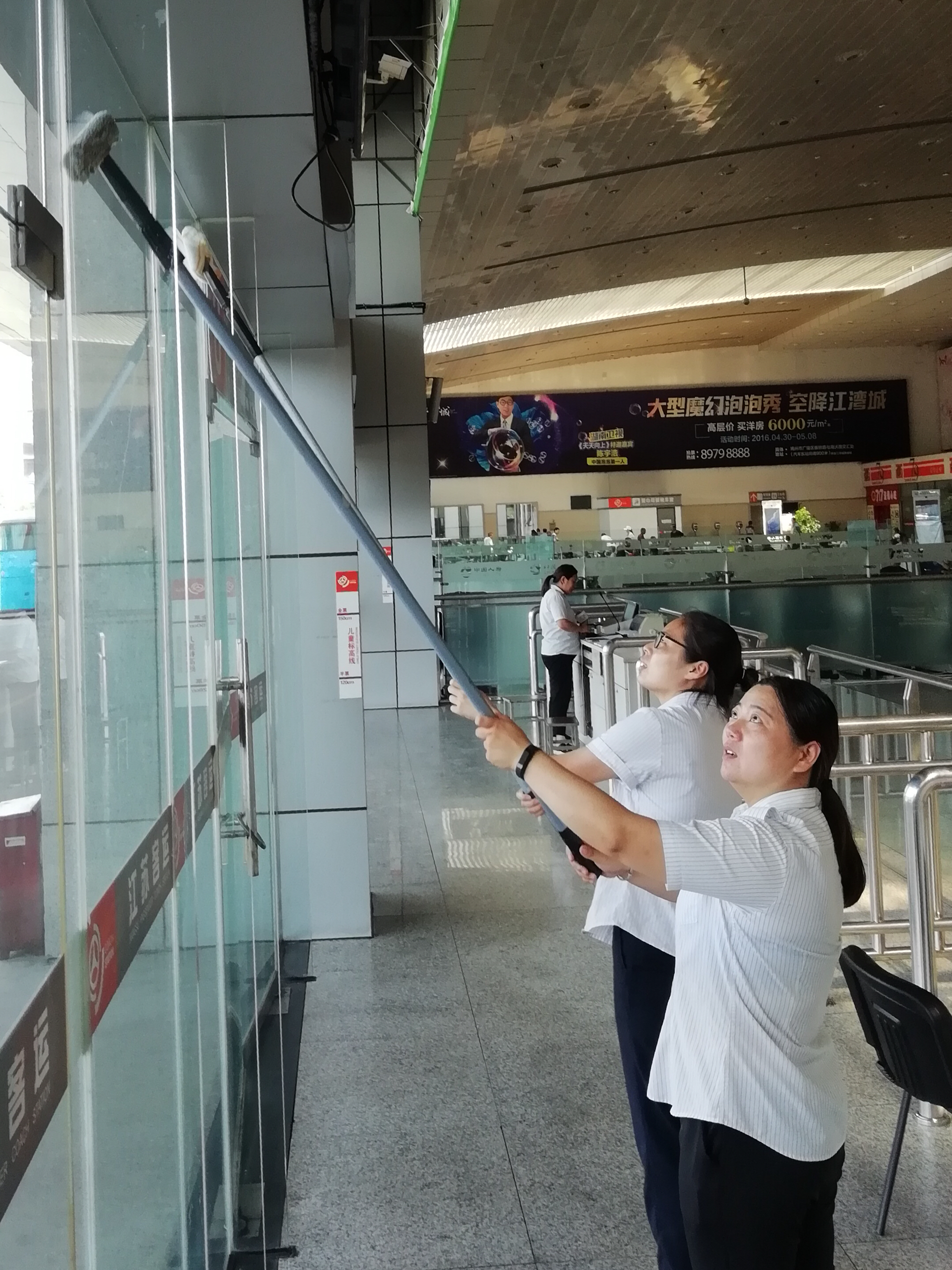 我市愛(ài)國(guó)衛(wèi)生委員會(huì)向全市發(fā)出創(chuàng)建衛(wèi)生城的號(hào)召,東站干群立即行動(dòng)起來(lái),成立以徐建波為組長(zhǎng)的創(chuàng)建衛(wèi)生城領(lǐng)導(dǎo)小組,宣傳組、后勤組、督查組分工明確,專(zhuān)人負(fù)責(zé),對(duì)全站重點(diǎn)部位展開(kāi)拉網(wǎng)式檢查,綠化、門(mén)窗、地面、燈光、水電、副業(yè)網(wǎng)店、宣傳氛圍等方面嚴(yán)格按照市愛(ài)國(guó)衛(wèi)生委員會(huì)文件要求逐一排查,整改到位。下客區(qū)、停車(chē)場(chǎng)、閘口地面年久失修,影響旅客和車(chē)輛出行,交投和集團(tuán)分管領(lǐng)導(dǎo)親臨一線,安排施工隊(duì)進(jìn)場(chǎng)作業(yè),加班加點(diǎn),現(xiàn)在地面已經(jīng)面目一新。綠化帶苗木缺失,研究方案,已補(bǔ)苗改造到位,玻璃長(zhǎng)廊鐵框銹跡斑斑,立即安排工人冒高溫到現(xiàn)場(chǎng)油漆作業(yè)奮戰(zhàn)兩天,現(xiàn)在已經(jīng)煥然一新。東站各部門(mén)、班組排了衛(wèi)生值班表,每天對(duì)照創(chuàng)建衛(wèi)生城的標(biāo)準(zhǔn),對(duì)工作場(chǎng)所包干區(qū)的衛(wèi)生進(jìn)行認(rèn)真打掃清理。