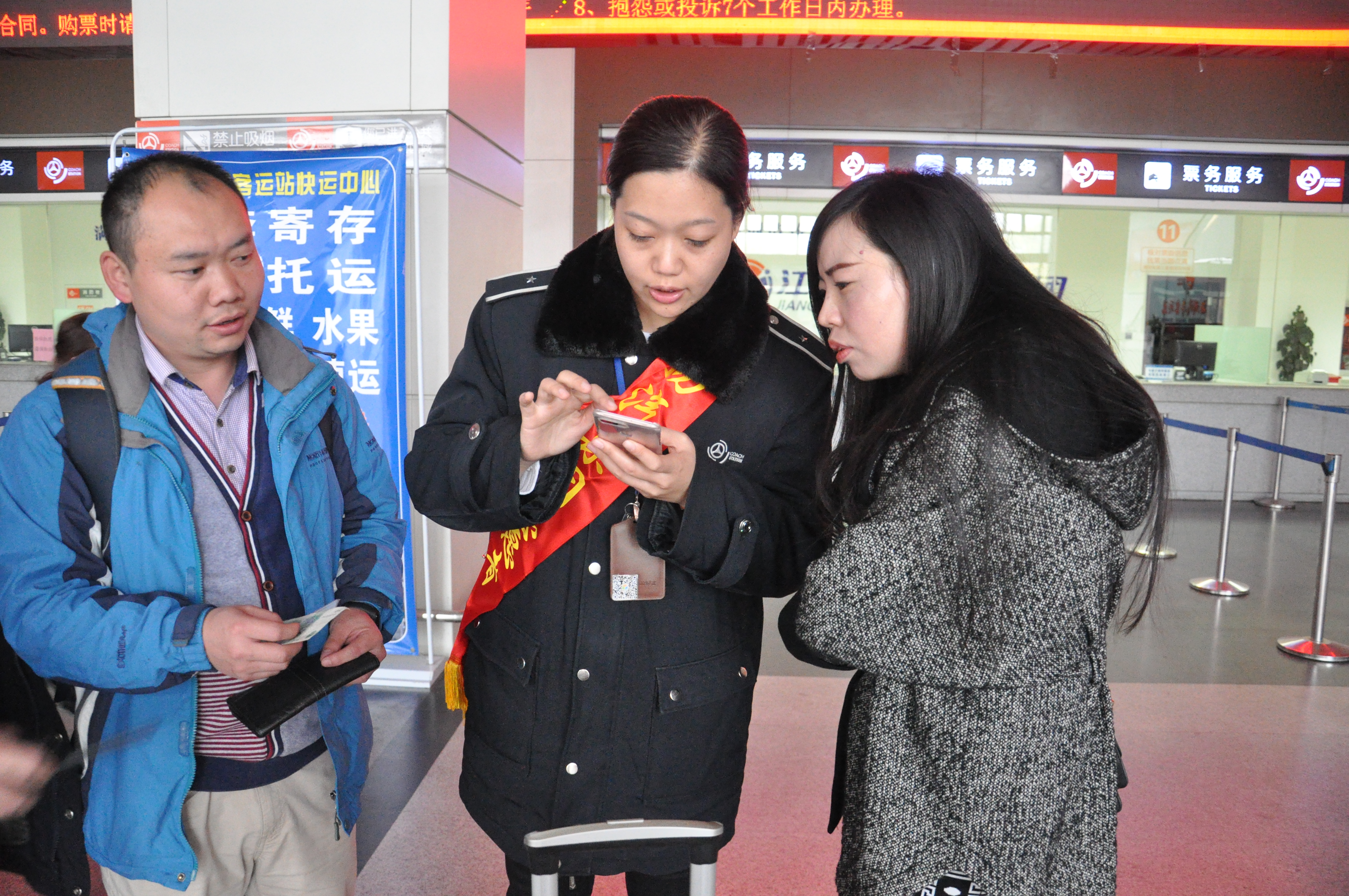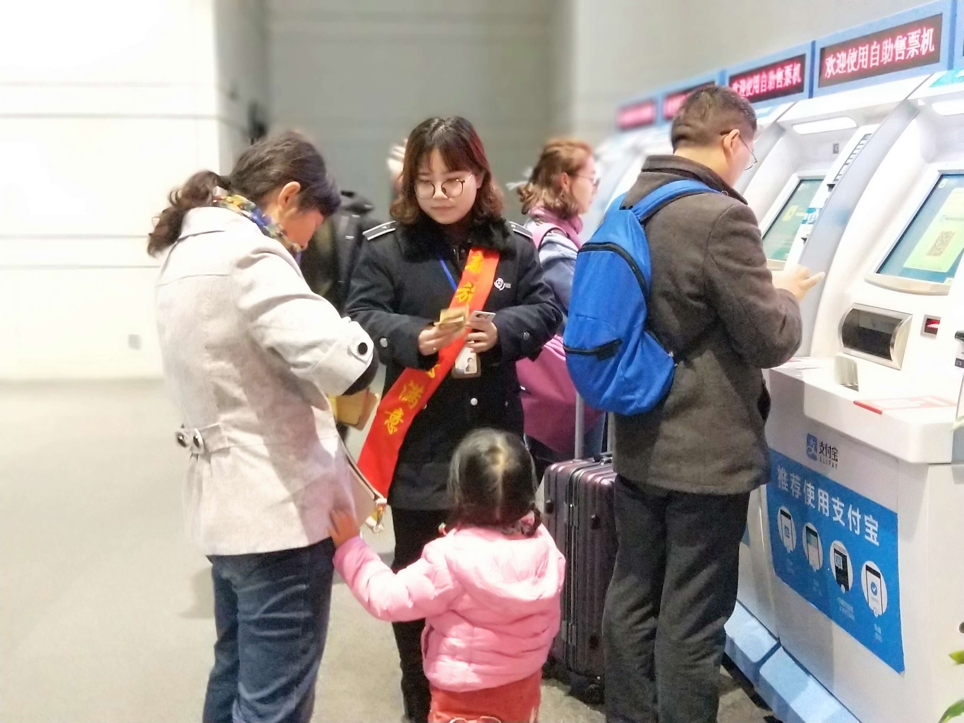 在售票大廳里,有一支身披“新旅途 心滿意”綬帶的工作人員隊(duì)伍,正在有條不紊地引導(dǎo)著前來(lái)購(gòu)票的旅客,通過(guò)手機(jī)或者自助機(jī)的形式進(jìn)行購(gòu)票。原來(lái),車站現(xiàn)場(chǎng)按照站長(zhǎng)室近期重點(diǎn)工作的部署,主動(dòng)在客流放緩的情況下有序進(jìn)行售票自助化、智能化的嘗試。下午3點(diǎn)現(xiàn)場(chǎng)除退票窗口外,其余窗口臨時(shí)停售,售票員紛紛走出售票窗口,將導(dǎo)乘、購(gòu)票功能前置。