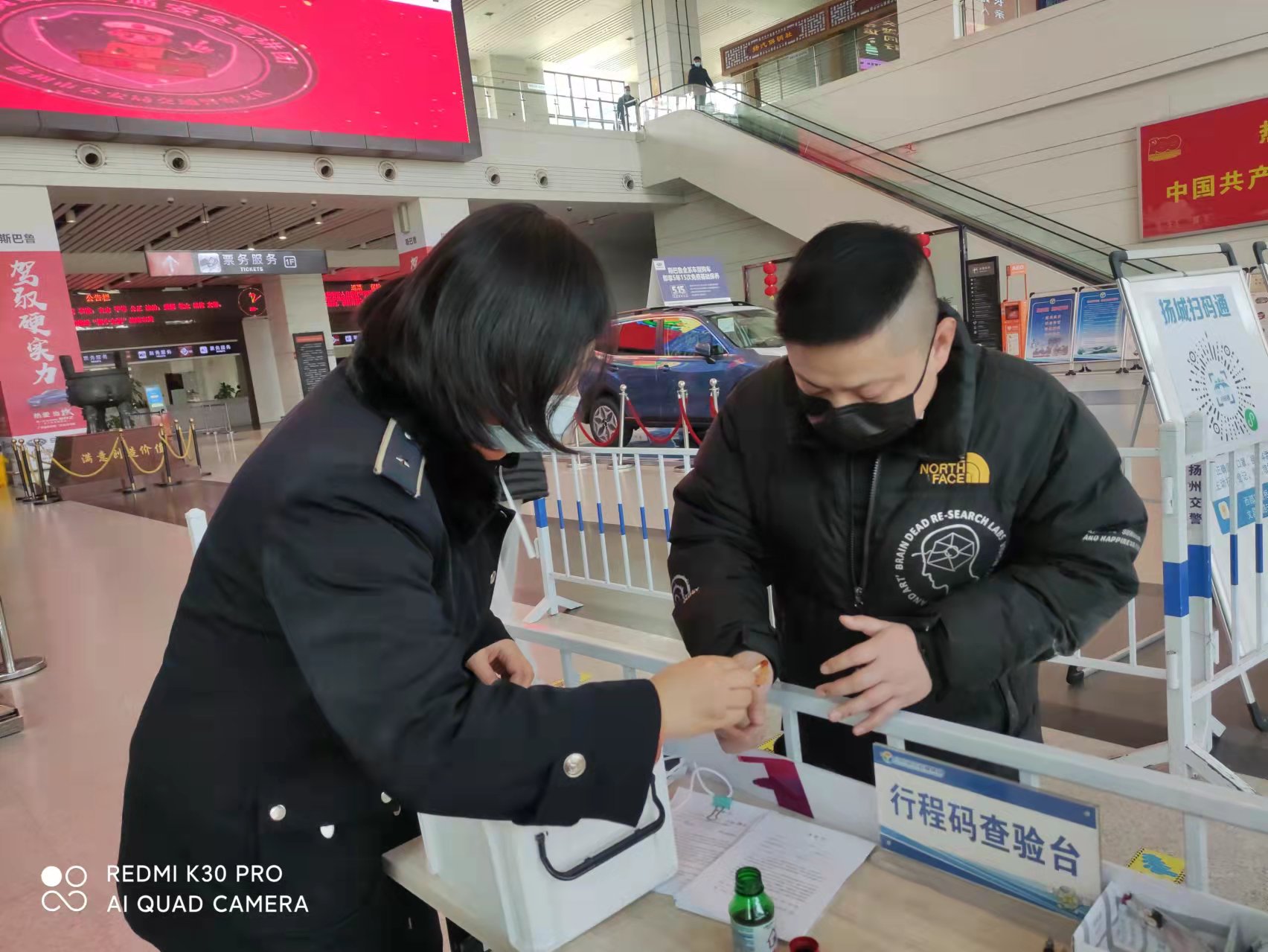 下午一點(diǎn)半,揚(yáng)州汽車站售票大廳門口,正在認(rèn)真查驗(yàn)行程碼的劉揚(yáng),看著對面遞身份證過來的一雙手,手上傷痕累累,手里握著一團(tuán)紙巾,紙巾上血跡斑斑,于是關(guān)切地詢問起來。經(jīng)詢問得知,原來旅客于先生是常州人,在揚(yáng)州出差三天了,估摸著今天的工作能夠忙完,想早點(diǎn)趕回常州,工作一結(jié)束,便從工作地點(diǎn)騎公共電動車來揚(yáng)州汽車站乘車,誰知一個不小心,摔了一跤,羽絨服破了,手機(jī)摔壞了,兩只手也蹭破了好幾處,血不停地淌。